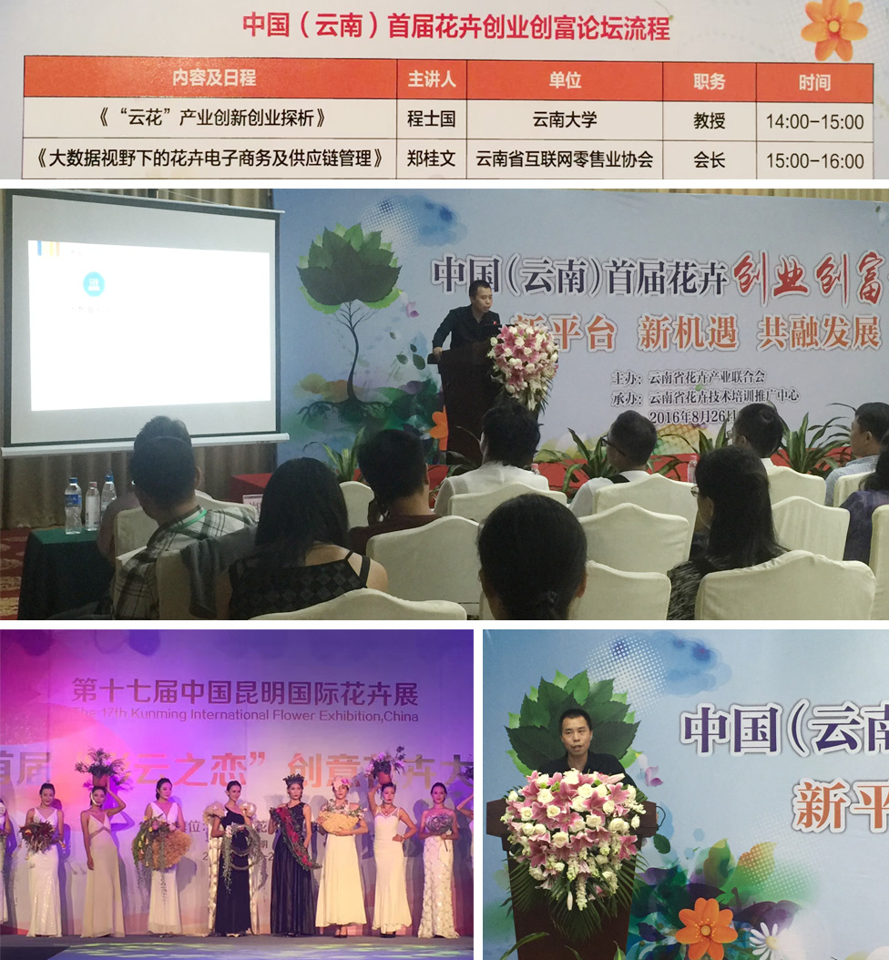 2016年6月26日,第十七屆中國(guó)昆明國(guó)際花卉展在昆明國(guó)際會(huì)展中心舉辦,云南天度科技股份有限公司作為一家互聯(lián)網(wǎng)服務(wù)商應(yīng)邀參展;主辦方還舉辦了首屆花卉創(chuàng)業(yè)創(chuàng)富論壇,多位專家學(xué)者齊聚一堂,共話云南花卉創(chuàng)新發(fā)展路。天度集團(tuán)董事長(zhǎng)、云南省互聯(lián)網(wǎng)零售業(yè)協(xié)會(huì)會(huì)長(zhǎng)鄭桂文先生作為主講嘉賓參加了“中國(guó)(云南)首屆花卉創(chuàng)業(yè)創(chuàng)富論壇”,并作主題為“大數(shù)據(jù)視野下的花卉電子商務(wù)和供應(yīng)鏈管理”的演講。