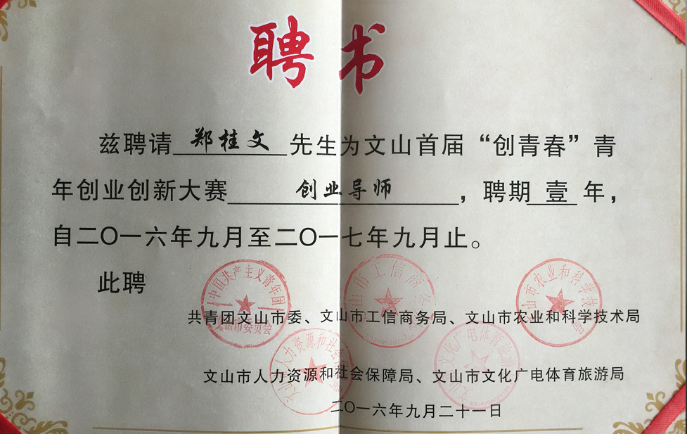 2016年9月21日10點,由文山市委副書記劉建萍同志宣布:文山市首屆‘創(chuàng)青春’青年創(chuàng)業(yè)創(chuàng)新大賽正式啟動,并為天度集團董事長鄭桂文等五位創(chuàng)業(yè)導師頒發(fā)了導師聘書。