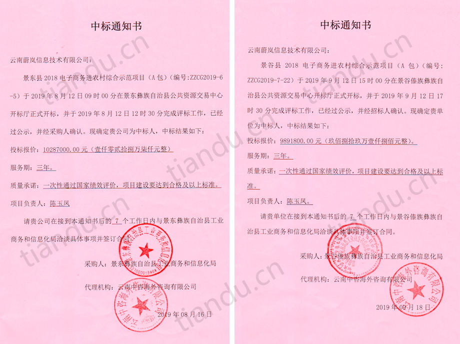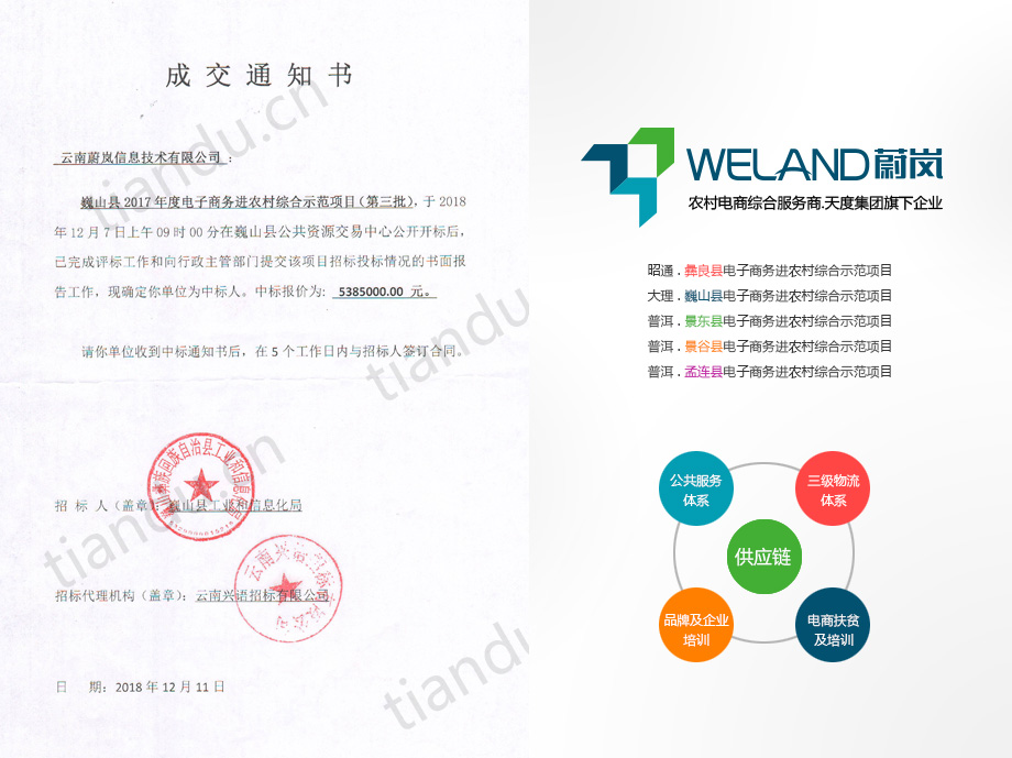 祝賀天度集團(tuán)旗下“云南蔚嵐信息技術(shù)有限公司”中標(biāo)景東縣、景谷縣、孟連縣等三個(gè)縣的電子商務(wù)進(jìn)農(nóng)村綜合示范項(xiàng)目,目前云南蔚嵐信息技術(shù)有限公司已經(jīng)為昭通市彝良縣、大理州巍山縣、普洱市景東縣、普洱市景谷縣、普洱市孟連縣等5個(gè)縣提供了國家電子商務(wù)進(jìn)農(nóng)村綜合示范縣項(xiàng)目的服務(wù)。