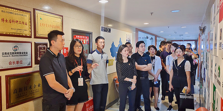 2020年7月7日下午,共青團臨滄市委書記丁玲一行15人在共青團昆明市委副書記林勤同志及共青團西山區(qū)委書記吳陽青同志的陪同下來到天度集團,圍繞青年電商創(chuàng)業(yè)、直播帶貨、電商扶貧等內(nèi)容進行考察交流