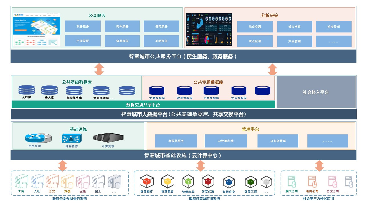 依托互聯(lián)網(wǎng)、云計(jì)算、大數(shù)據(jù)、物聯(lián)網(wǎng)、空間地理信息等現(xiàn)代科技和信息化手段,強(qiáng)化信息資源跨界融合運(yùn)用,大力推進(jìn)跨部門、跨系統(tǒng)、跨行業(yè)的數(shù)字資源利用,匯聚政務(wù)、企業(yè)、個(gè)人、感知等數(shù)據(jù)及資源,及時(shí)感測(cè)、收集、分析和運(yùn)用城市及產(chǎn)業(yè)信息,解決交通擁堵、預(yù)警滯后、環(huán)境污染、資源分配失衡、人口膨脹、城市脆弱等一系列“城市病”;通過(guò)數(shù)據(jù)治理形成城市人口、法人、宏觀經(jīng)濟(jì)、地理空間等基礎(chǔ)數(shù)據(jù)庫(kù)和各行業(yè)專項(xiàng)數(shù)據(jù)庫(kù),達(dá)到城市數(shù)據(jù)縱向清晰、橫向關(guān)聯(lián),深度分析與挖掘城市數(shù)據(jù),為民生應(yīng)用、企業(yè)發(fā)展、政府決策提供智慧支撐, 推進(jìn)城市規(guī)劃、建設(shè)、運(yùn)行、服務(wù)、綜合管理、應(yīng)急處置智能化。