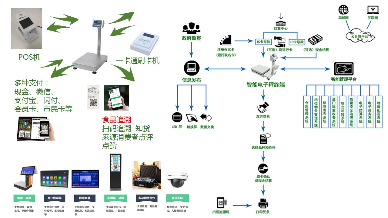 利用物聯(lián)網(wǎng)、云計(jì)算、大數(shù)據(jù)、人工智能、區(qū)塊鏈等信息技術(shù),為市場(chǎng)配備了智慧電子稱、商戶屏、攝像監(jiān)控等設(shè)備及智慧管理平臺(tái),涵蓋“市場(chǎng)、商戶、物業(yè)、經(jīng)營(yíng)、場(chǎng)務(wù)、數(shù)據(jù)、設(shè)備”各方面管理,實(shí)現(xiàn)市場(chǎng)可管控、可感知、可追溯、合同電子化、收費(fèi)智能化、運(yùn)營(yíng)智慧化、數(shù)據(jù)一體化,極大降低了人工成本。利用AI技術(shù),實(shí)現(xiàn)水電、停車、人員、防疫等的智能管理,促進(jìn)市場(chǎng)有序高效運(yùn)行,同時(shí)大數(shù)據(jù)實(shí)時(shí)記錄公開(kāi)透明,產(chǎn)品價(jià)格、農(nóng)殘檢測(cè)、產(chǎn)品溯源、商戶證照信息一目了然,交易可追溯,讓老百姓的"菜籃子”拎得更舒心、放心、開(kāi)心。