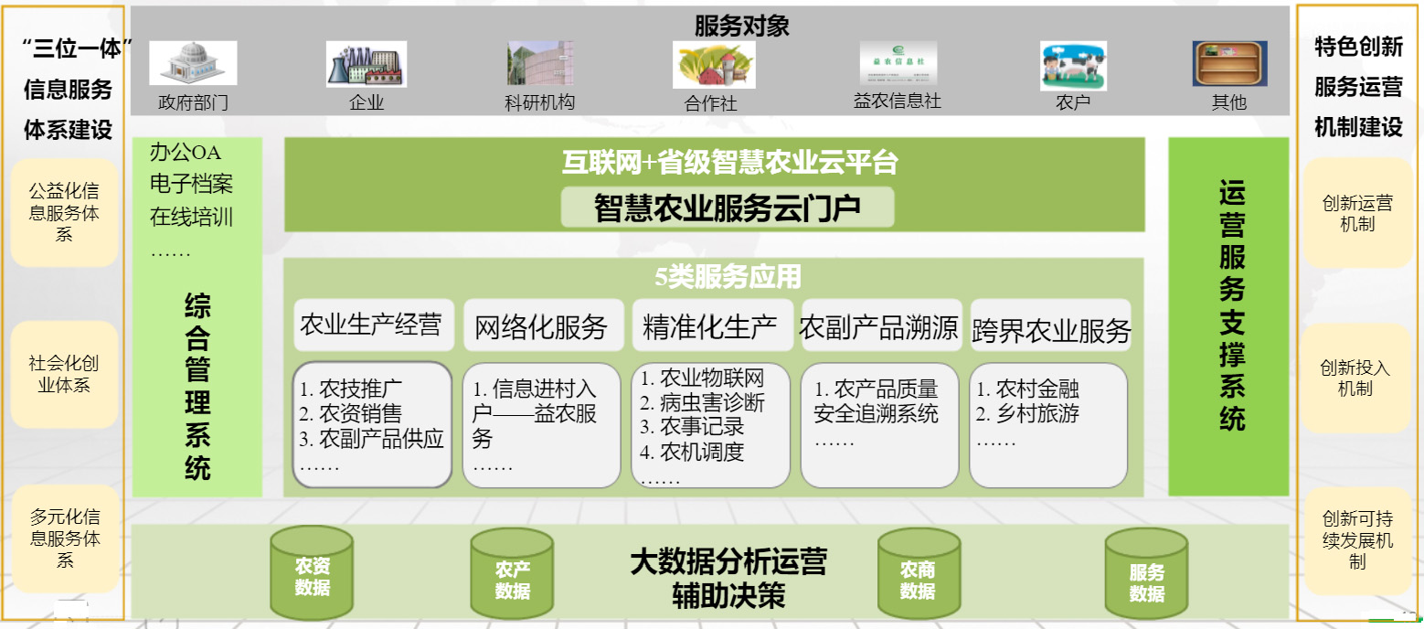 以農(nóng)業(yè)資源為基礎(chǔ)、市場(chǎng)為導(dǎo)向、效益為中心、產(chǎn)業(yè)化為抓手,面向農(nóng)業(yè)管理部門、農(nóng)技推廣部門、農(nóng)業(yè)企業(yè)、農(nóng)業(yè)園區(qū)/基地、農(nóng)業(yè)專家、農(nóng)民等多層次用戶體系,充分利用計(jì)算機(jī)與網(wǎng)絡(luò)技術(shù)、物聯(lián)網(wǎng)技術(shù)、音視頻技術(shù)、無(wú)線通信技術(shù)、大數(shù)據(jù)技術(shù)、云計(jì)算及專家智慧與知識(shí),集成傳感器、土壤墑情采集站、監(jiān)控視頻頭、水肥藥一體機(jī)、太陽(yáng)能氣象站、太陽(yáng)能捕蟲(chóng)儀、太陽(yáng)能電磁閥、智能手機(jī)等智能化自動(dòng)化設(shè)備,建設(shè)以農(nóng)產(chǎn)品質(zhì)量安全、農(nóng)資安全監(jiān)管、農(nóng)業(yè)區(qū)域資源為主的監(jiān)管平臺(tái),以種植指導(dǎo)、病蟲(chóng)害防治、標(biāo)準(zhǔn)化生產(chǎn)、農(nóng)業(yè)物聯(lián)網(wǎng)、農(nóng)業(yè)生產(chǎn)診斷決策為主的生產(chǎn)管理平臺(tái),以及以農(nóng)業(yè)資訊、農(nóng)產(chǎn)品價(jià)格走勢(shì)、農(nóng)產(chǎn)品交易、營(yíng)銷推廣、質(zhì)量溯源、植物醫(yī)院、農(nóng)技推廣服務(wù)、人力資源服務(wù)為主的信息服務(wù)平臺(tái),實(shí)現(xiàn)更完備的信息化基礎(chǔ)支撐、更集中的數(shù)據(jù)資源、更深入的政府監(jiān)管、更先進(jìn)的生產(chǎn)管理、更貼心的公眾服務(wù),實(shí)現(xiàn)農(nóng)業(yè)生產(chǎn)、監(jiān)管、服務(wù)一體化支撐,以及農(nóng)業(yè)農(nóng)村全方位、全過(guò)程的信息化、智慧化管理,達(dá)到信息技術(shù)與產(chǎn)業(yè)發(fā)展的和諧提升,推動(dòng)現(xiàn)代農(nóng)業(yè)快速發(fā)展。