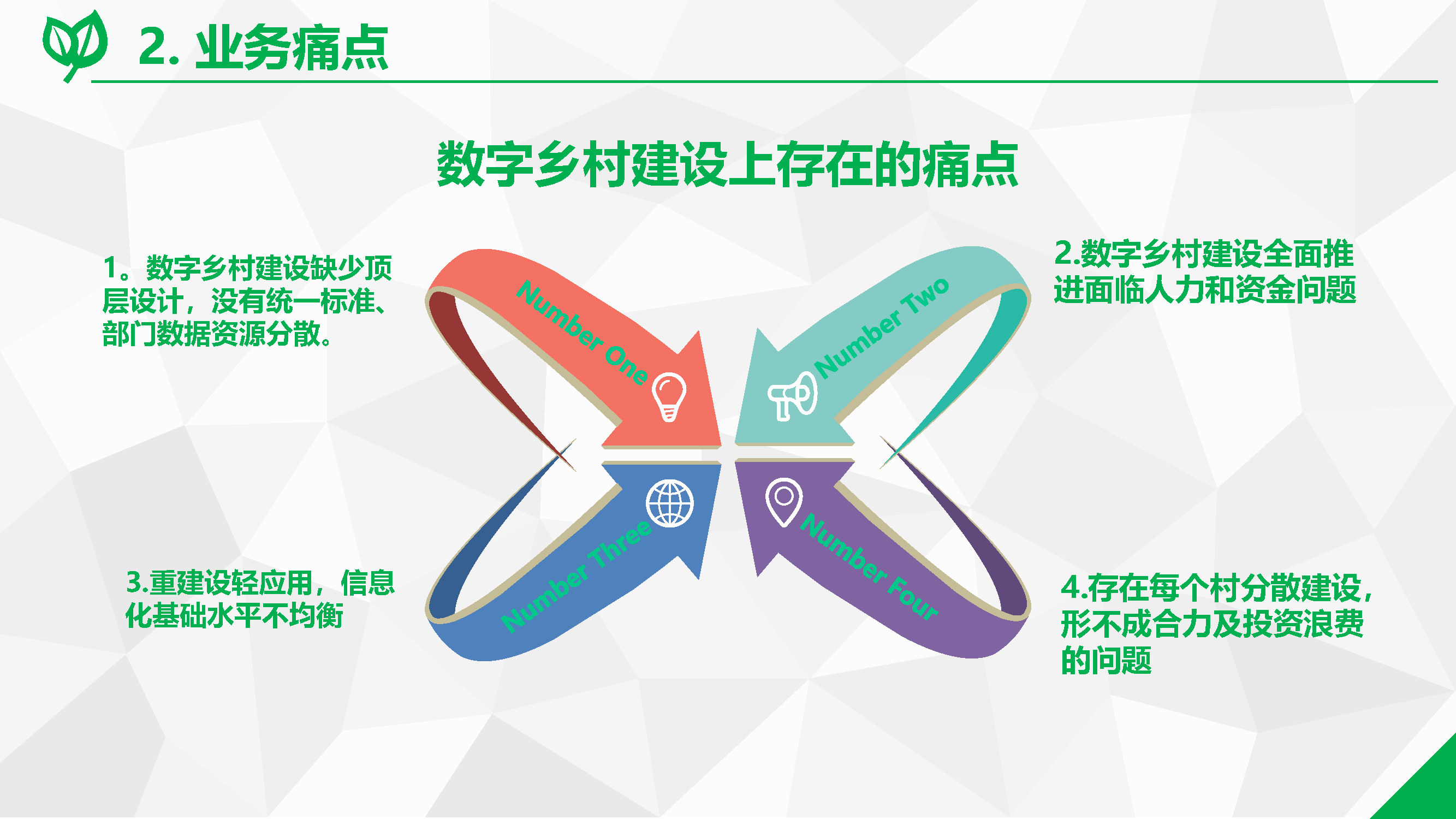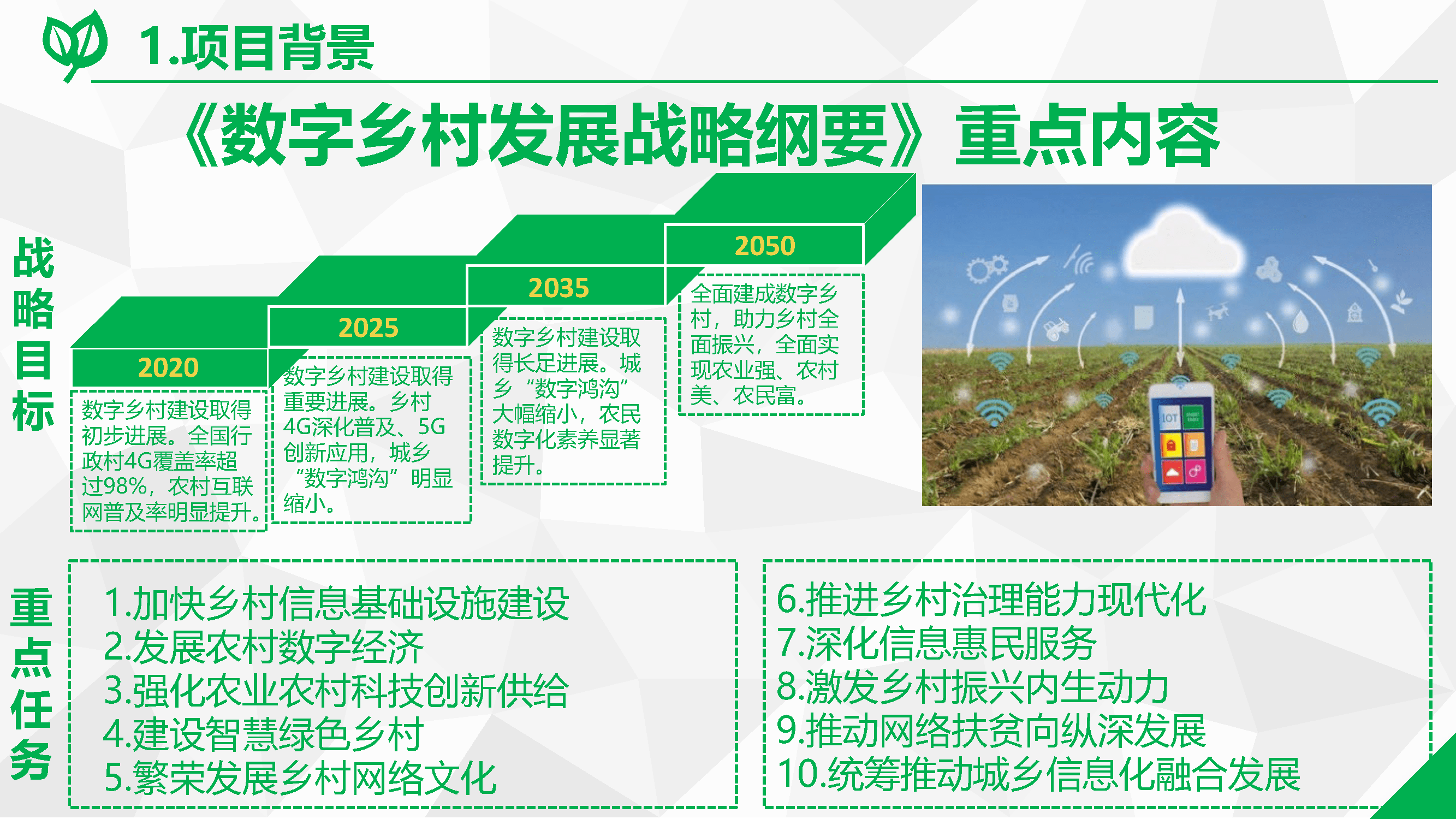 1、數(shù)字鄉(xiāng)村整體規(guī)劃:因地制宜地編制縣域數(shù)字鄉(xiāng)村建設規(guī)劃,做好整體設計,明確發(fā)展定位、建設目標、重點任務及工程和實施步驟,完善配套政策措施,統(tǒng)籌推進數(shù)字鄉(xiāng)村和智慧城市建設,有效發(fā)揮信息技術創(chuàng)新的擴散效應、信息和知識的溢出效應、數(shù)字技術釋放的普惠效應,促進城鄉(xiāng)融合發(fā)展。
