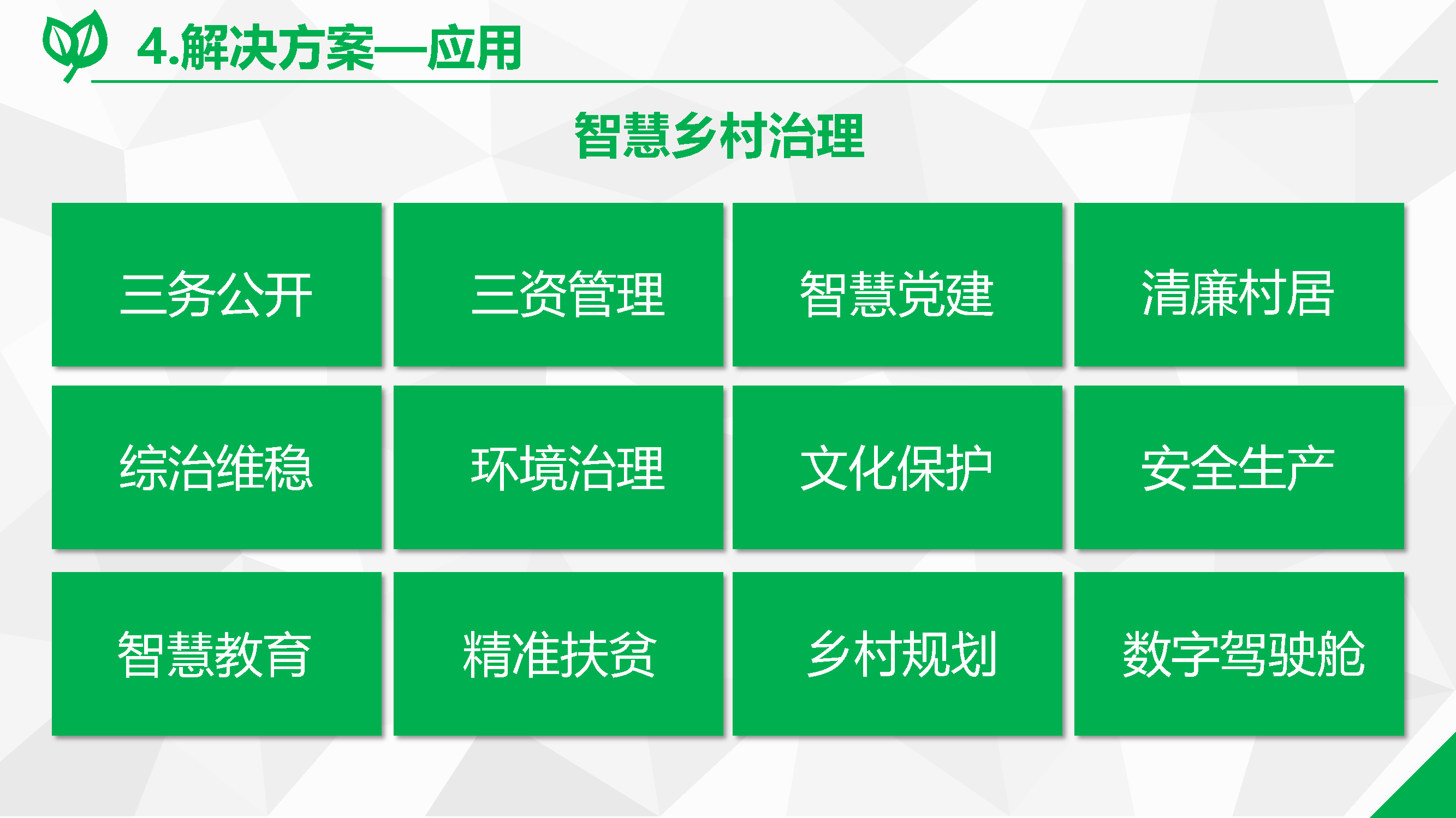 根據(jù)鄉(xiāng)村振興戰(zhàn)略的總體部署,鄉(xiāng)村治理工作應著重提升智能化、精細化與專業(yè)化水平。因此,結合自身的數(shù)字化應用開發(fā)能力,聚焦智慧黨建、村鎮(zhèn)環(huán)境保護,以及城鎮(zhèn)綜合行政執(zhí)法工作的數(shù)字化,為縣域建立健全數(shù)字治理新模式提供支撐。