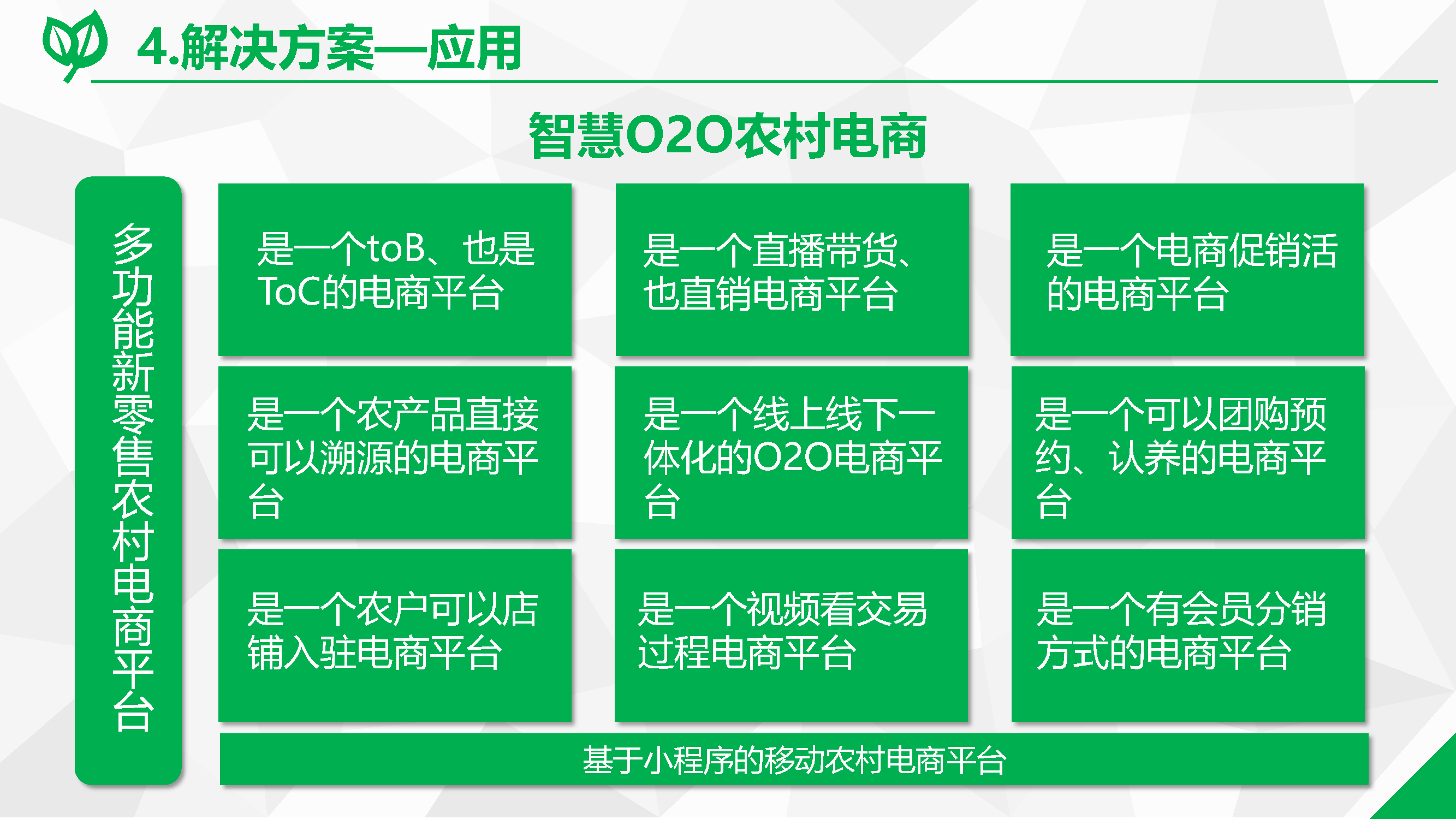 2、特色產(chǎn)業(yè)電商規(guī)劃:規(guī)劃內(nèi)容包括產(chǎn)業(yè)主體調(diào)研、核心產(chǎn)品調(diào)研和產(chǎn)業(yè)診斷及規(guī)劃。根據(jù)調(diào)研情況,依托全網(wǎng)線上多平臺沉淀的交易和用戶特征數(shù)據(jù),建立縣域產(chǎn)業(yè)發(fā)展數(shù)據(jù)模型,輸出相關分析結論,提出對縣域電子商務產(chǎn)業(yè)發(fā)展的具體建議和行動實施方案。明確縣域電子商務發(fā)展的定位、理清總體發(fā)展思路,確定分階段發(fā)展目標,能夠聚焦重要任務,給出指導意見和實施建議,為政府制定縣域電商發(fā)展戰(zhàn)略,針對縣域電子商務建設提出行動綱領,實現(xiàn)縣域經(jīng)濟的轉型升級提供決策參考。