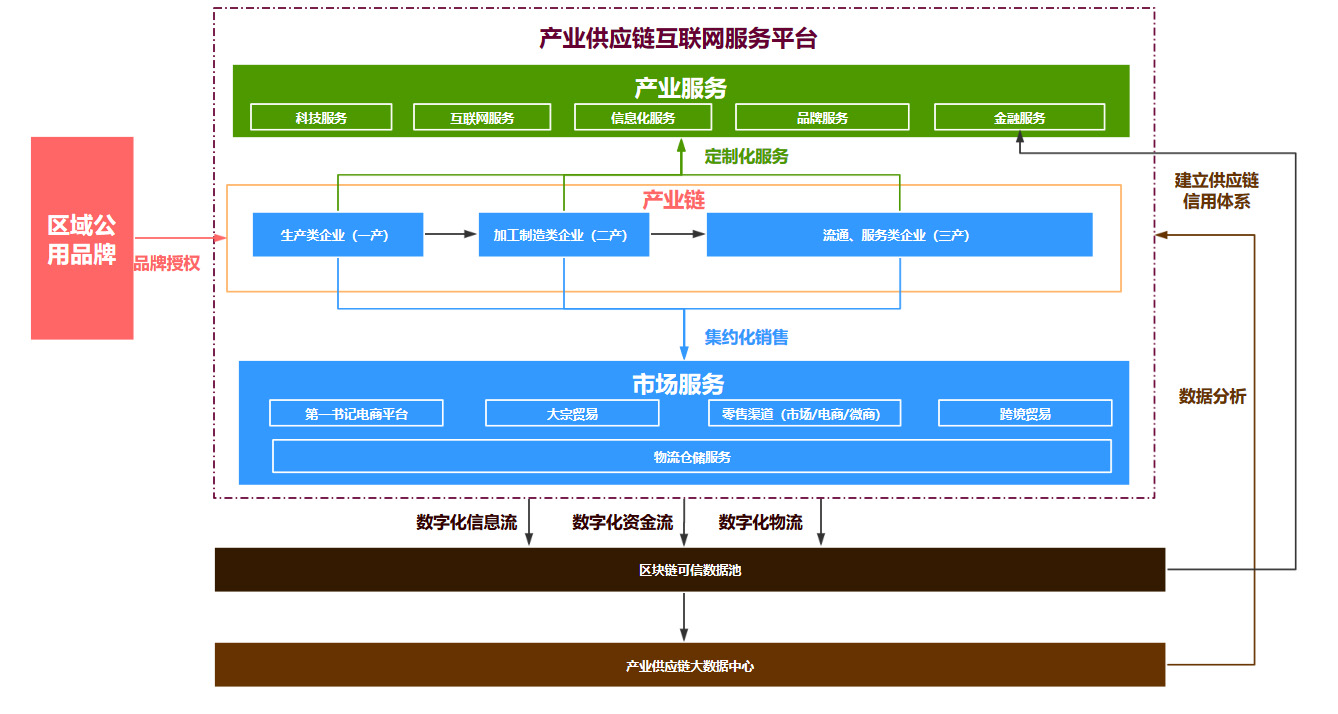 數(shù)字化供應(yīng)鏈服務(wù)平臺(tái)應(yīng)立足區(qū)域傳統(tǒng)產(chǎn)業(yè)、優(yōu)勢產(chǎn)業(yè)及重點(diǎn)支柱產(chǎn)業(yè),將電子商務(wù)將與發(fā)展需求充分結(jié)合,建立線上線下一體化的服務(wù)體系。平臺(tái)將區(qū)域品牌化體系建設(shè)為產(chǎn)業(yè)標(biāo)準(zhǔn)入口,服務(wù)于供應(yīng)鏈內(nèi)各企業(yè)主體,貫穿產(chǎn)業(yè)鏈從生產(chǎn)端、加工制造端、流通端全鏈條,以提升供應(yīng)鏈各主體協(xié)同效率。同時(shí),平臺(tái)以數(shù)字化為核心手段及時(shí)獲取供應(yīng)鏈信息流、物流、資金流等數(shù)據(jù),并基于區(qū)塊鏈技術(shù)建立一套產(chǎn)業(yè)可信數(shù)據(jù)池,應(yīng)用大數(shù)據(jù)分析技術(shù)對(duì)供應(yīng)鏈進(jìn)行動(dòng)態(tài)分析,最終實(shí)現(xiàn)智慧化供應(yīng)鏈系統(tǒng),成為基于數(shù)字化供應(yīng)鏈的集約化、智能化、創(chuàng)新性的開放式產(chǎn)業(yè)生態(tài)平臺(tái),以市場化、數(shù)據(jù)化、智慧化的運(yùn)營方式促進(jìn)產(chǎn)業(yè)升級(jí),創(chuàng)造價(jià)值與財(cái)富。