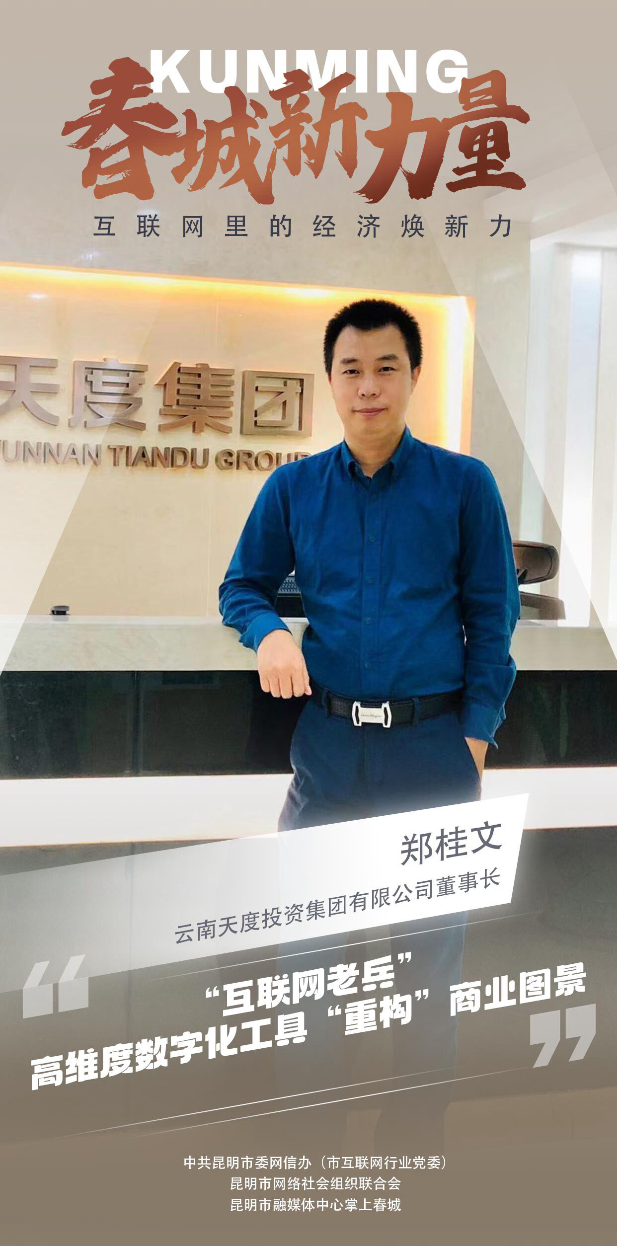 扎根互聯(lián)網(wǎng)20余年,云南天度投資集團有限公司董事長鄭桂文形容自己是“互聯(lián)網(wǎng)老兵”。作為昆明最早一撥從事互聯(lián)網(wǎng)的“探索者”,不論是技術(shù)限制還是當(dāng)時云南互聯(lián)網(wǎng)產(chǎn)業(yè)的萌芽狀態(tài),鄭桂文經(jīng)歷過迷茫和困難,但是在技術(shù)和理念的更新迭代背后,不變的是執(zhí)著情懷和對行業(yè)的熱愛。“互聯(lián)網(wǎng)行業(yè)充滿了創(chuàng)新精神,有無限的可能,很適合年輕一代的創(chuàng)業(yè)群體。”