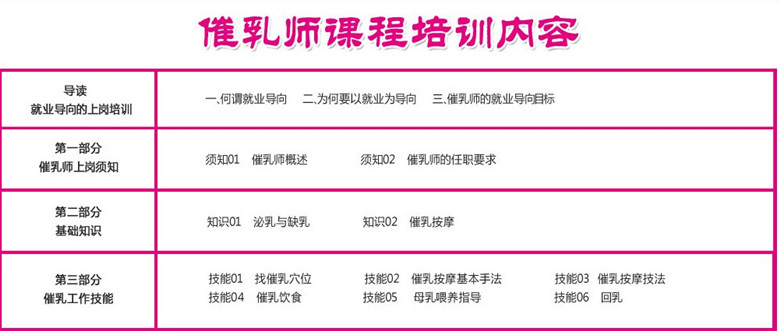 培訓(xùn)學(xué)校由專業(yè)人員組成的培訓(xùn)隊(duì)伍,專門針對希望自主創(chuàng)業(yè)、熱愛母嬰護(hù)理行業(yè)的健康女性,開設(shè)了催乳師培訓(xùn)班。本專業(yè)以產(chǎn)婦產(chǎn)后催乳(開奶)、回乳(斷奶)、乳房疾病預(yù)防、日常乳房保健護(hù)理等知識為理論基礎(chǔ),以中醫(yī)按摩、穴位療法為手法,長期培訓(xùn)女性專業(yè)催乳師。